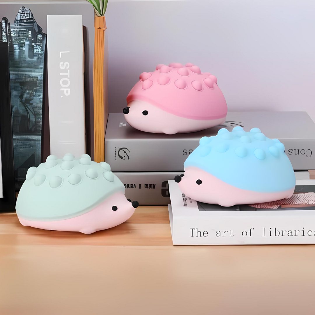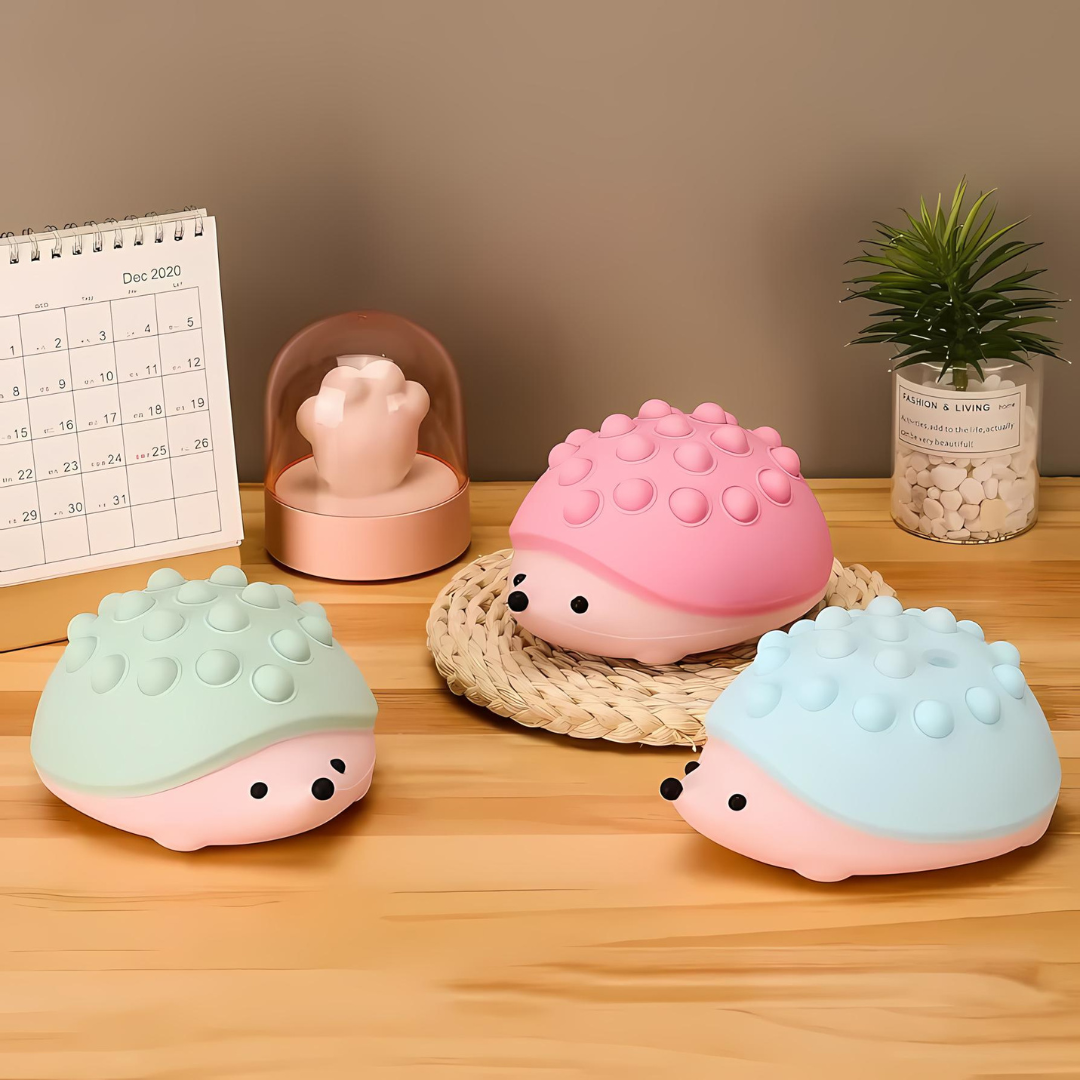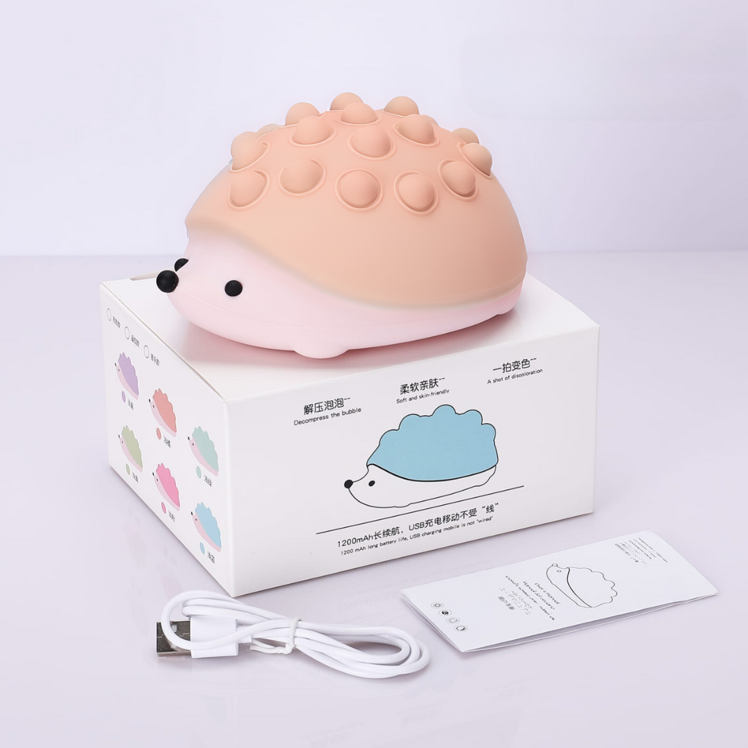 Illuminate your space with the Hedgehog Silicone Night Light, available in three quirky colors: Pink, Green and Peach. This cute night light features a soothing color-changing function, creating a calming ambiance in any room. The lovely hedgehog design is not only visually appealing but also practical, with soft decompression bubbles on its back that provide a fun and tactile experience, perfect for relieving stress and anxiety.